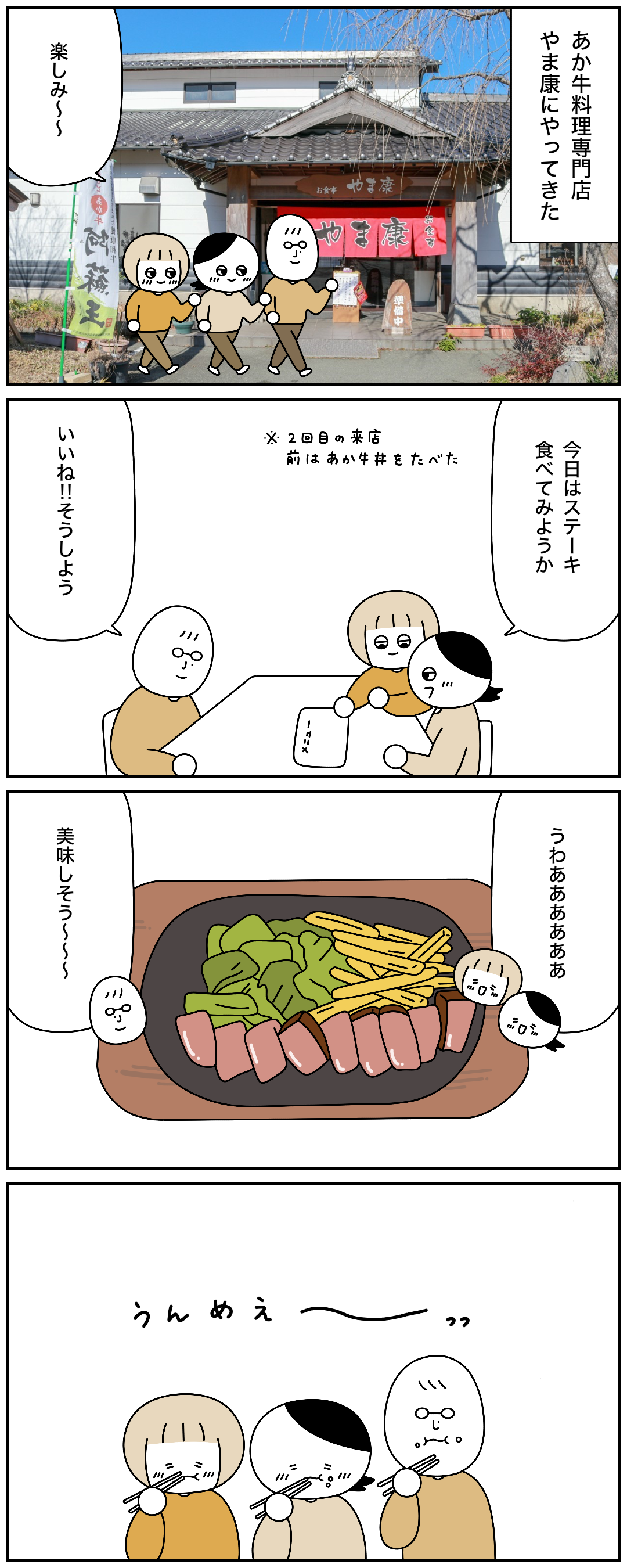 2025年01月17日 【阿蘇】あか牛食べに行ってきた めちゃくちゃ美味しかったです!赤身が多くて適度な脂肪分も含んでいるので、うま味もありつつさっぱりしてました。あか牛は阿蘇・矢部および球磨地方で飼われていた在来種とシンメンタール種が交配された固有種で、昭和19年に和牛として登録されたそうです。耐寒・耐暑性に優れていて、性格もおとなしいので放牧に適しているんだとか。阿蘇に行くことがあればぜひ!公式ホームページおすすめ回 タグ :#エッセイ#コミックエッセイ#絵日記#漫画が読めるハッシュタグ 「お出かけ」カテゴリの最新記事 < 前の記事次の記事 > コメント コメントフォーム 名前 コメント 記事の評価 リセット リセット 顔 星 情報を記憶 コメントを投稿する