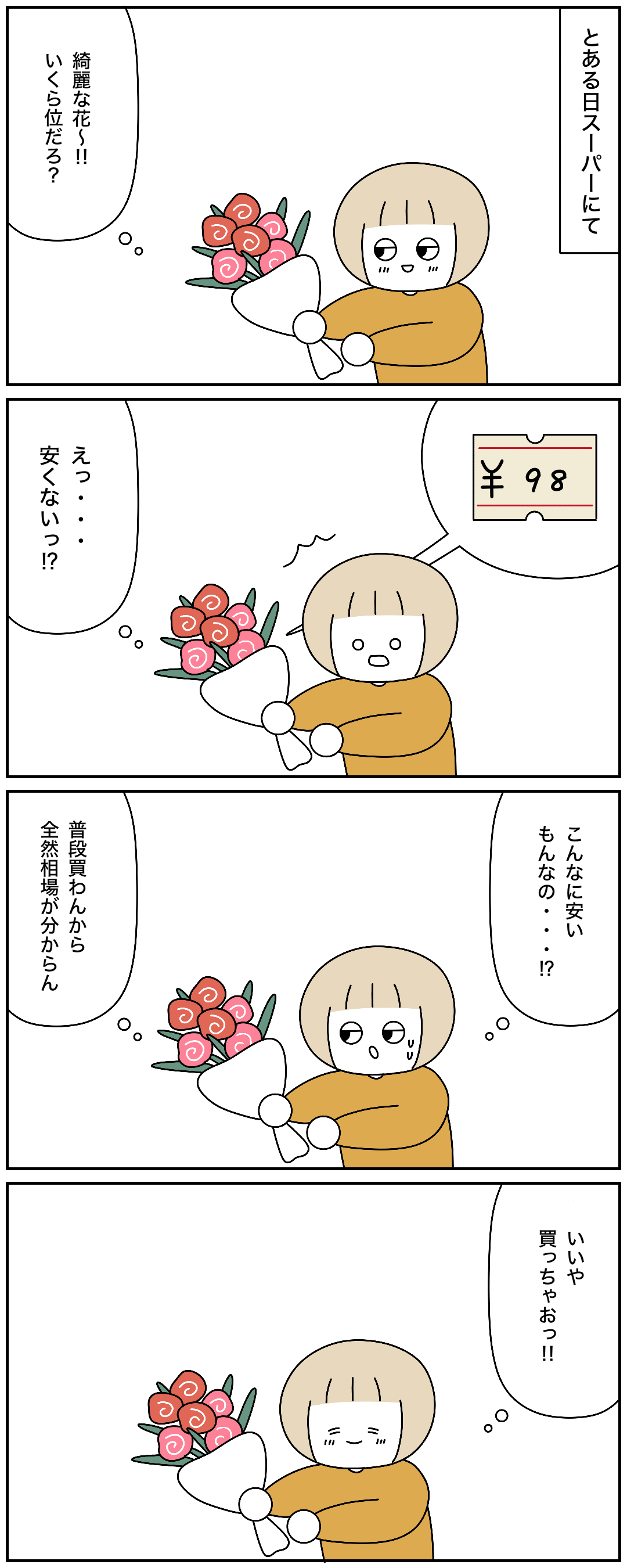 2025年03月19日 久々に花を買ってみた 久々に買ったので全然相場が分かりません。でも多分安いですよね…?母の花瓶を借りて玄関に飾ってみました。毎日癒されてます。おすすめ回 タグ :#エッセイ#コミックエッセイ#絵日記#漫画が読めるハッシュタグ 「たね」カテゴリの最新記事 < 前の記事次の記事 > コメント コメントフォーム 名前 コメント 記事の評価 リセット リセット 顔 星 情報を記憶 コメントを投稿する