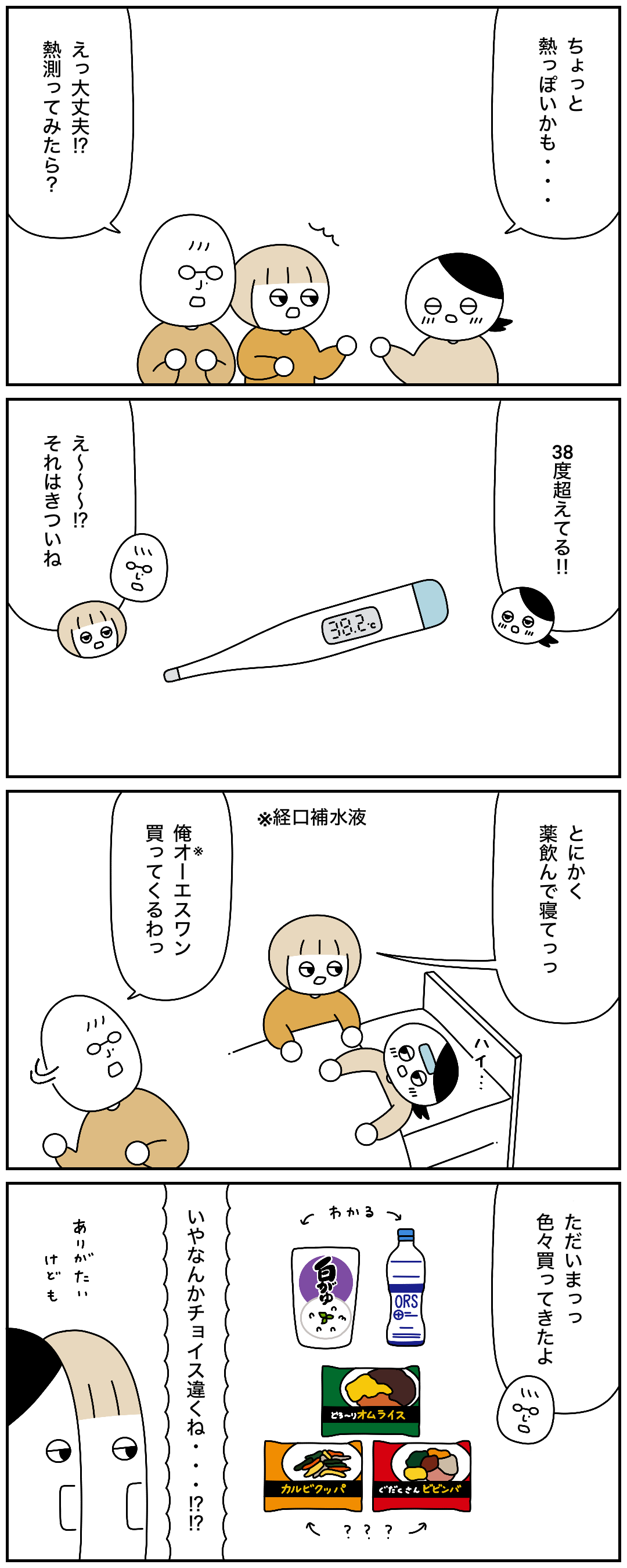 2025年03月26日 買い出しのチョイスが微妙な父 ゼリーとか果物とかは⁉︎ってなりました。経口補水液もオーエスワンじゃなくて違うメーカーという。まあ買ってきてくれるだけでもありがたいのですが…笑その後母の熱は無事下がりました!おすすめ回 タグ :#エッセイ#コミックエッセイ#絵日記#漫画が読めるハッシュタグ 「ももの家」カテゴリの最新記事 < 前の記事次の記事 > コメント コメントフォーム 名前 コメント 記事の評価 リセット リセット 顔 星 情報を記憶 コメントを投稿する