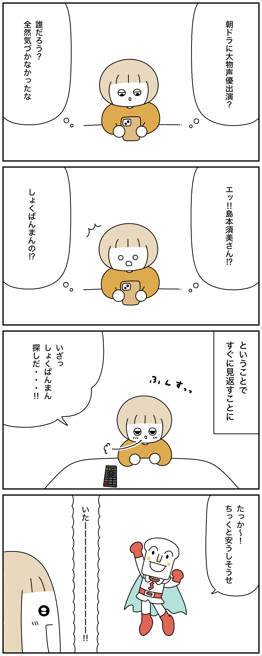 2025年04月11日 朝ドラに大物声優が出演していたと聞いて 第8回(4月9日放送)に出演していました!5分57秒くらいです。めちゃくちゃいい声で、さすが声優さんだなあと思いました☺️気づかなかったのが不思議なくらい。今後、チーズ役の山寺宏一さんも出演するみたいなので楽しみです。朝ドラ⤵️ タグ :#エッセイ#コミックエッセイ#漫画が読めるハッシュタグ#絵日記#日常漫画 「たね」カテゴリの最新記事 < 前の記事次の記事 > コメント コメントフォーム 名前 コメント 記事の評価 リセット リセット 顔 星 情報を記憶 コメントを投稿する