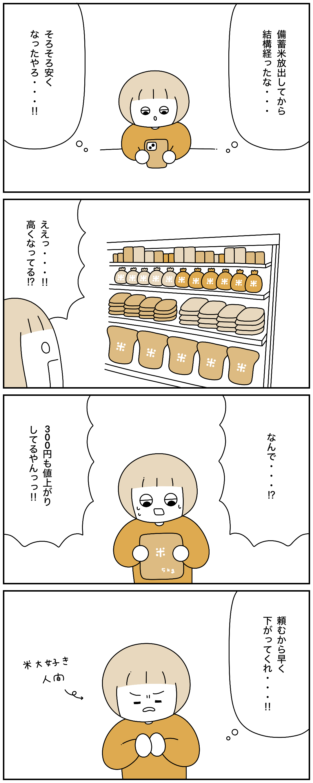 2025年04月25日 米っていつ安くなるん? まさかの値上がり😓備蓄米放出してから結構経った気がするんですが…早く下がってくれ〜スケブも高くなってました⤵️ タグ :#エッセイ#コミックエッセイ#漫画が読めるハッシュタグ#絵日記#日常漫画 「たね」カテゴリの最新記事 < 前の記事次の記事 > コメント コメントフォーム 名前 コメント 記事の評価 リセット リセット 顔 星 情報を記憶 コメントを投稿する