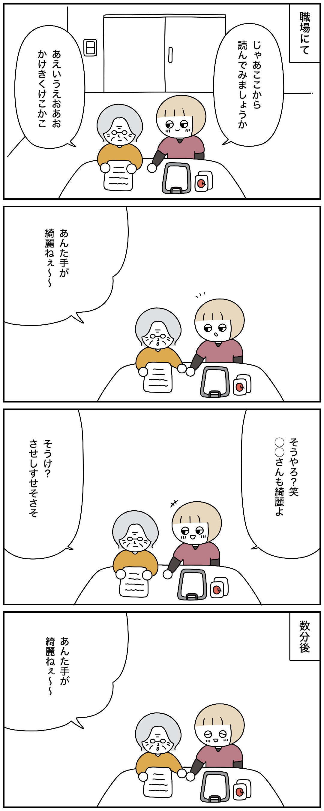 2025年05月01日 何度も褒めてくれるおばあちゃん 1日5回くらい褒めてくれます。何回褒められても嬉しい☺️こんなおばちゃんになりたいものです。おすすめ回 タグ :#エッセイ#コミックエッセイ#漫画が読めるハッシュタグ#絵日記 「仕事」カテゴリの最新記事 < 前の記事次の記事 > コメント コメントフォーム 名前 コメント 記事の評価 リセット リセット 顔 星 情報を記憶 コメントを投稿する